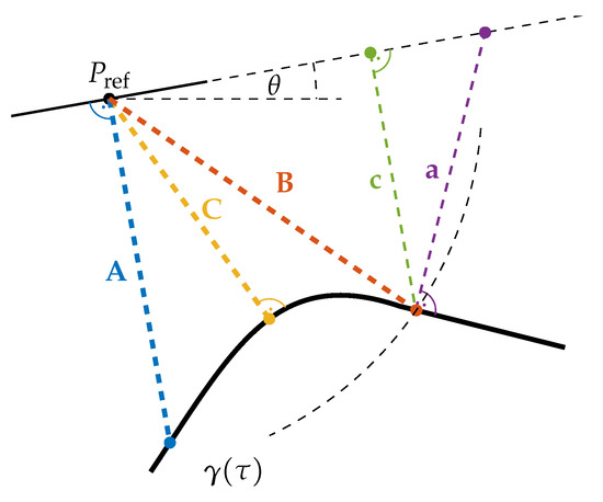 Point projection is a well investigated topic, but still an ongoing research field in geometry (see, for example, [46,47,48,49]). Although for some path representations (e.g., if the path consists of circular arcs) an analytic solution exists, most implementations apply iterative numeric methods, similar to path operation A, to compute approximations of the solution. The existence of a solution is not ensured. A widely used fallback for tracking controllers is to transition to the shortest-distance-problem. A solution to this fallback problem always exists and if a solution to the point projection problem exists, the solutions are equivalent. The ambiguity of the solution can be handled based on the path direction (choosing the solution which gains the most progress along the reference path).
