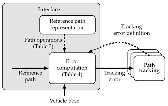 The comprehensive investigations of the last sections provide the theoretical backbone in order to state the general requirements for a generic planning and control interface from control side. The central idea for the interface implementation is to detach the tracking error computation from the control component. On the one hand, this avoids redundant computations in different control components. On the other hand, it enables careful coordination with respect to the representation of the provided reference path. This supports the performance of the overall system, which is especially of interest in safety critical applications like collision avoidance. According to Section 3, the definition of three classifiers (vehicle reference point, look-ahead and error orientation) is sufficient to define the lateral tracking error definition applied in state-of-the-art path tracking controllers. Furthermore, according to Section 4, three elementary path operations are sufficient to compute all possible tracking errors, which can be defined based on the introduced tracking error classifiers. Hence, these elementary path operations can be implemented with respect to the reference path representation outside of the actual path tracking component, in order to supply various different tracking controllers with the required tracking error, as illustrated in Figure 8.