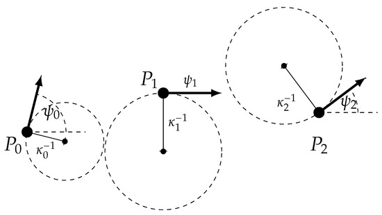 Exemplary G2 Hermite waypoint data, consisting of position P, orientation and curvature .