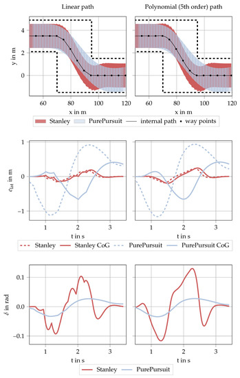 according to the distance between center of gravity and center of percussion and the heading error . Therefore, the vehicle reference point is assigned to the center of gravity. In [27,28,31], an MPC is applied for path tracking. In every MPC step, actuation signals are optimized with respect to a specific cost function on a prediction horizon. In general, the cost function includes a deviation from the reference path, i.e., a lateral tracking error. Instead of an evaluation of the tracking error at a single vehicle pose (cf. Figure 8), hence additionally an evaluation at several predicted vehicle poses is required.