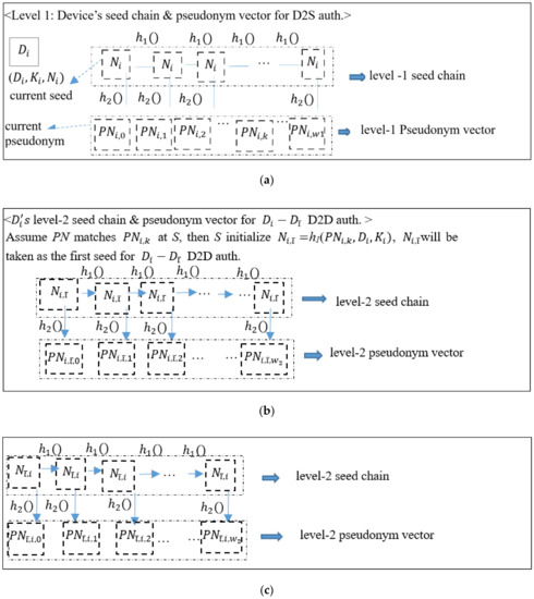 (a) ’s level-1 seed and pseudonyms; (b) ’s level-2 seed and pseudonyms for D2D authentication; (c) ’s level-2 seed and pseudonyms for D2D authentication.