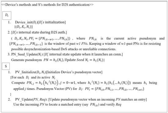 Device_init() is for initializing s initial parameters. s PN_Seed_Update() method is executed when each time initiates a D2S authentication request; in this method, first generates the current pseudonym and then updates its seed .