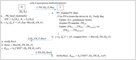 - Updating-and-synchronizing pseudonym. The challenges of adopting pseudonyms to achieve anonymity include (a) how do we efficiently maintain the pool of pseudonyms, and (b) how do we synchronize the pseudonyms to avoid possible desynchronization-based DoS attacks. Preloading lots of pseudonyms are suggested in some publications; however, it is not suitable for those resource-limited devices. Other systems update and synchronize the pseudonym during each authentication session. Updating-and-synchronizing pseudonyms per session does not require large storage space, but it should tackle the threats of possible desynchronization attacks or it incurs very costly overhead to renew the corresponding certificates or CLPKs.