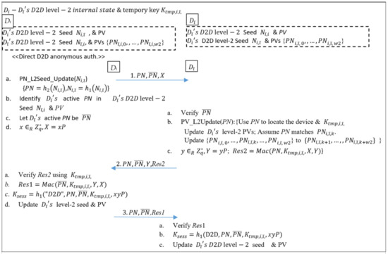 Once two devices successfully complete one instance of the S-assist-once-a-while D2S2D anonymous authentication, they can run w2 instances of the direct D2D anonymous authentication without the involvement of the server. Figure 6 depicts the flow. The top of Figure 7 shows the internal state of and level-2 seed and pseudonym vectors, and the rest shows the flow. The details are described as follows.