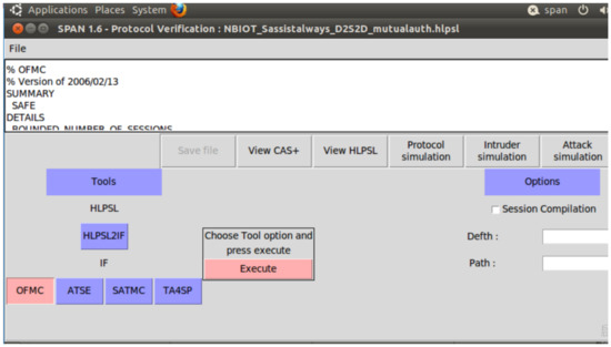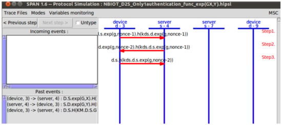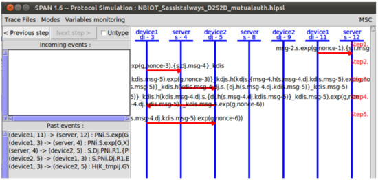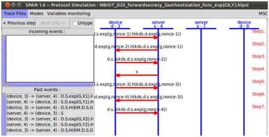 Figure 7 shows the protocol simulation of the D2S authentication, where “device d-3” and “server s-4” exchange messages and accomplish the authentication. Figure 8 shows the result of the OFMC verifier on the D2S authentication; the result of the OFMC on the D2S authentication is “SAFE”—no successful attacks can be plotted.