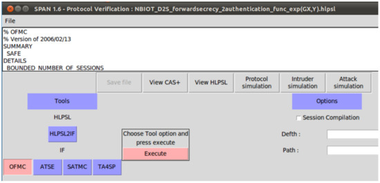Next, we examined the forward secrecy of the D2S authentication. Figure 9 shows the message flow, where “device d-3” and “server s-4” accomplished two runs of authentications, and the intruder knew the secrets of the 2nd session; the result shows that OFMC verifier could not plot any successful attacks on the 1st session. The result was “SAFE” in Figure 10.
