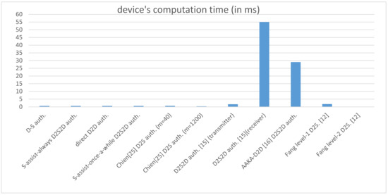 Figure 13 shows the bar charts of the estimated computation time (in ms), using the figures from Table 5. The left four items are the proposed schemes. From Figure 13, we can see that the computation times of our schemes, Chien’s schemes [25], and Fang et al.’s level-2 D2S group authentication are almost negligible, compared to those of Se-DS [15] and AAKA-D2D [16]. We can see that those pairing-based schemes [15,16,22] demand much larger computational costs. Of course, we have to note that the cost of Se-DS [15] include the pairing-based signatures and verifications operations for additional data sharing.