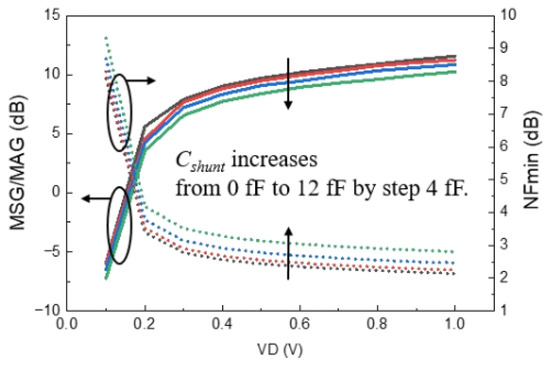 Figure 2 shows the circuit schematic of the 4-stage differential VGA. In this work, we aimed to have a compact and low power consumption variable amplifier for the unified V2X-radar phased-array receiver applications in E-band. For the low DC power requirement, we reduced the drain voltage (VD) down to 0.5 V [18]. In order to estimate the performance degradation caused by the lowered VD, a simple simulation for maximum gain and minimum noise figure (NFmin) was conducted; the results are shown in Figure 3. Note that the drain current was fixed to 10 mA for an N-MOSFET differential pair in this calculation. When VD decreased from 1 V to 0.5 V, the gain and the noise figure degraded by approximately 1.8 dB and 0.3 dB, respectively. Those are believed acceptable for the benefit in the DC power consumption reduction by half. The amplifier consists of four stages of an N-MOSFET differential core to get a high gain and to decrease common mode noise. The total gate width of the core transistors is 34.5 μm (1.5 μm × 23 fingers) and impedance matching was achieved using low-k transformers for wideband operation.