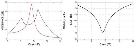 Equations (3) and (4) from Figure 4 show that capacitive neutralization can improve reverse isolation and gain [17]. Theoretically, the perfect isolation can be implemented as Cneu is equal to the Cgd.