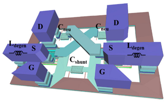 Neutralization has been widely employed to improve reverse isolation and gain of amplifiers by eliminating parasitic gate-drain capacitance (Cgd) of transistors [15,16,17,18,19]. This unintended feedback path caused by Cgd led to an unstable amplifier and caused signal loss and gain reduction. Each stage of the amplifier was capacitively neutralized with cross-coupling neutralization capacitor (Cnue) to cancel Cgd. Figure 4 is the small signal equivalent circuit with capacitive neutralization considering only parasitic gate-drain capacitance. Y-parameters of the 2-port network can be written as follows: