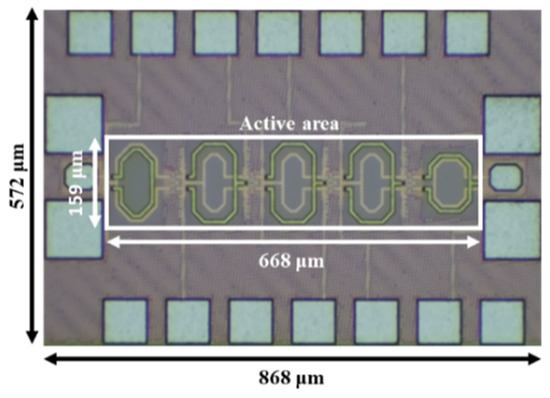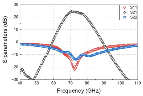 The four-stage variable-gain VGA was fabricated in the 40-nm CMOS technology, and the microphotograph is shown in Figure 9. The active area of the proposed amplifier is 668 μm × 159 μm without DC and RF pads. The total drain current was 38.2 mA from 0.5‑V supply at the peak gain condition. RF measurement was performed with an on-wafer probing system and a 110-GHz vector network analyzer. The effect of the RF pads was not de-embedded here. Figure 10 shows measured small signal S-parameters of the amplifier. The VGA achieved peak gain of 24.5 dB at 71.3 GHz with 3-dB bandwidth of around 10 GHz in 68 GHz–78 GHz span. Thanks to the inductive degeneration, good input return loss less than −10 dB was achieved in the operating frequency band even with the noise matching.