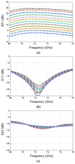 In this paper, we control inter-stage gate bias voltages to tune the amplifier gain. In this measurement, to get a variable gain, we controlled the second gate bias voltage, and the measurement results are shown in Figure 11. The peak and minimum gains were achieved with the gate voltages of 0.55 V and 0.225 V, respectively. Meanwhile, DC power consumption of the amplifier was reduced from 19.1 mW to 15.5 mW accordingly. As can be seen, S21 could be tuned by approximately 21 dB in maximum while maintaining the 3‑dB bandwidth of 10 GHz. Meanwhile, return losses at input and output ports were rarely changed and remained below 10 dB approximately in overall. At 73 GHz, input and output return loss variations were around 5.4 dB and 1.9 dB, respectively.