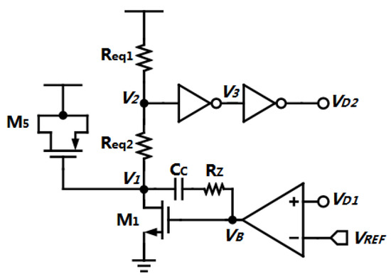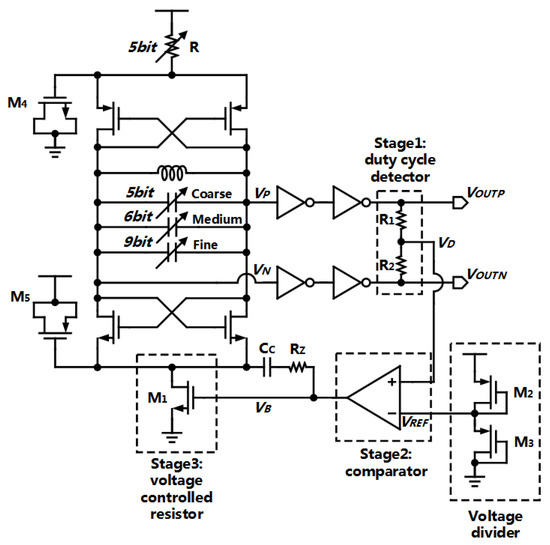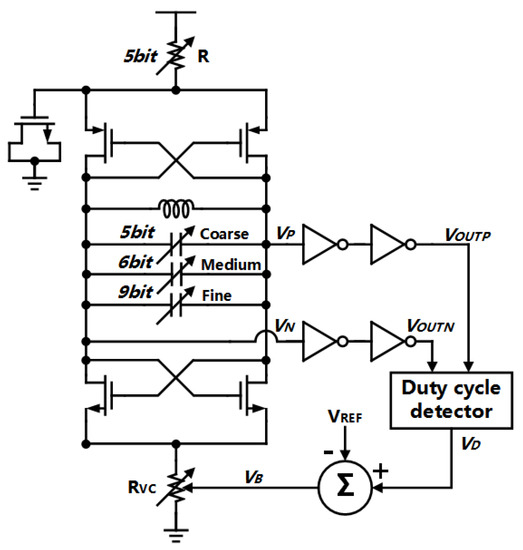 To reduce the complexity of analysis, we simplify the DCC loop, as in Figure 5. Since the AC components of oscillating signals have no influence on the DCC loop, the LC tank can be ignored. Two inverter chains are simplified as one chain to provide DC component. Furthermore, the tail resistor R and two pairs of cross coupled transistors are treated as equivalent resistors and .