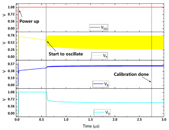 Figure 7 shows that the DCO starts to oscillate ( in Figure 7) at about 0.6 s after powering up. Then, the DCC circuit starts to calibrate the duty cycle of the output signals and the calibration finished at about 2.75 s. According to the shapes of signal and , it indicates that the DCC loop is a underdamping system which verifies the stability of the loop.