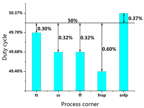 In order to verify the high accuracy and the robustness of the DCC scheme among the process variation, transient simulations with different process corners are carried out, as in Figure 8. The results indicates that the accuracy is 50 ± 0.6%.