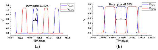 It is worth mentioning that, as R increases, the peak level of and decrease and the duty cycle problem of the output signal is serious. For the double data rate (DDR) systems and half/quarter-rate serial link transceivers, the duty cycle of the clock signals must be 50% accurately. Hence, a duty cycle correction (DCC) is necessary for the DCO. From previous studies [18,19,20,21,22], wide frequency range and high precision designs are introduced. Nevertheless, their structures are complicated and the power consumptions are high. A simple approach can be carried out by self-biased inverters (as in Figure 1). However, the power consumption of the self-biased inverters are significant, as well, and the coupling capacitors provide heavy loads to the DCO.