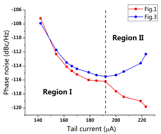 Figure 10 can be broken into two regions. If the tail current is large enough (Region II), the DCC circuit would have seriously negative influence on the phase noise performance of the proposed DCO. However, two lines are closed with each other which illustrates that if the tail current is small enough (Region I), the extra noise is not a significant trouble for low power design. FoMs against the tail current in two topologies presents in Figure 11. It is seen that the proposed circuit has lower FoM. We can conclude that the proposed DCC scheme saves much power by costing little performance of noise.