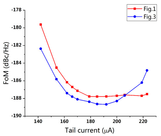 where is the phase noise of the oscillation carrier, is the offset frequency from the oscillation carrier, is the center frequency of the oscillation carrier, and is the power consumption of the DCO. The lower value of FoM means the higher efficiency of current consumption. The tail resistor in Figure 1 and Figure 3 are designated to be changeable for the search of the lowest FoM.