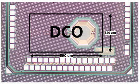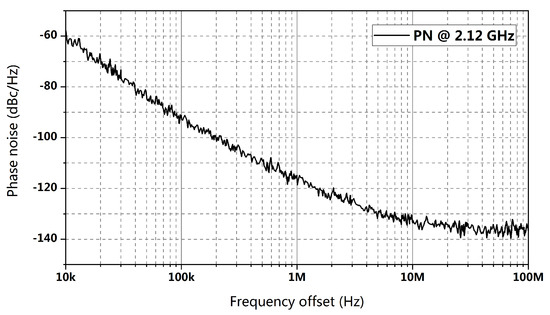 The proposed DCO is fabricated in 40 nm CMOS technology and the chip micrograph is shown, as in Figure 12. The area of the chip is 590 × 320 m. The chip measurement setup is shown, as in Figure 13. A Rohde & Schwarz FSW50 signal and spectrum analyzer was used to test the phase noise of the DCO, as shown in Figure 14. When the proposed circuit is oscillating at 2.12 GHz, the measured phase noise is −115 dBc/Hz at a 1 MHz offset. In addition, the measured power dissipation is 210 W, and the calculated FoM value is −189 dBc/Hz, which is close to the simulation results in Section 3.2.