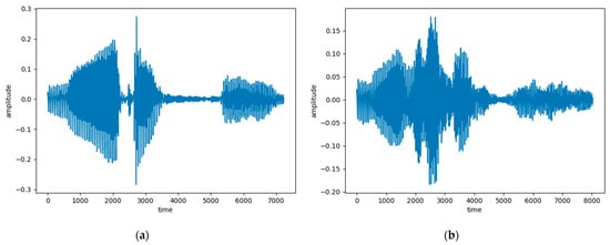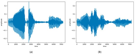 Refence [] created two additional original training data by modifying the speed to 90% and 110% of the original speed. In our study, we randomly selected the speed factor as a number between 0.9 and 1.1 for each iteration based on []. Figure 4 shows examples of the individual speed perturbation applied to a single input. We modified the speed using the time-stretch function of the librosa function.