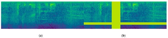 (a) Spectrogram of original input. (b) SpecAugment applied to the input. The x-axis is the time axis, the y-axis is the frequency axis, and the color is the intensity.