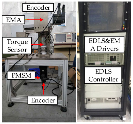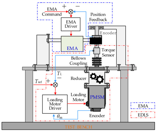 The arrangement of the considered EDLS in this paper used to simulate the dynamic load torque of EMA is presented in Figure 1. The mechanical structure of the EDLS system can be divided into two major parts according to different functions: one is the EMA under test worked in a position servo mode treated as the position servo system, and the other is the EDLS, consisting of a permanent magnet synchronous motor (PMSM) and its driver system treated as a torque servo system. As shown in Figure 1, the EDLS system consists of a servo motor, a reducer, two encoders, and the loaded EMA servo system. As the driving element of the EDLS, the PMSM is connected with a reducer, the torque sensor, and the loaded EMA through the coupling. The reducer is used to magnify the electromagnetic torque output of the PMSM to achieve large mechanical torque output. The torque sensor measures the torque signal on the transmission mechanism and transmits it to the control equipment to form a torque feedback loop.