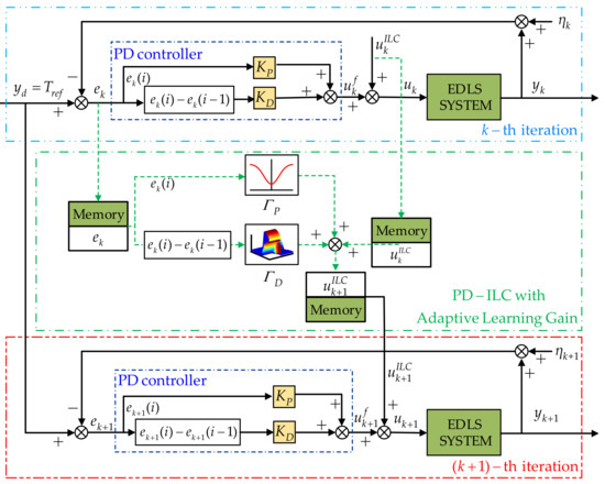 The ILC uses the input signals and error signals gained from previous iterations to continuously correct the inaccurate control signals, so as to get an appropriate control input that can achieve the desired tracking performance from trail-to-trail [22]. However, the conventional PD-type ILC with fixed learning gains can hardly deal with the aperiodic measurement noise of a nonlinear system [23]. In order to improve the torque tracking performance of the EDLS, the schematic diagram of proposed controller is shown in Figure 2.