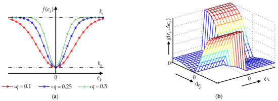 The effect of different parameters on the shape of the nonlinear function and the relationship between and the error can be seen in Figure 3a. The typical nonlinear function versus the error and its first difference are shown in Figure 3b.