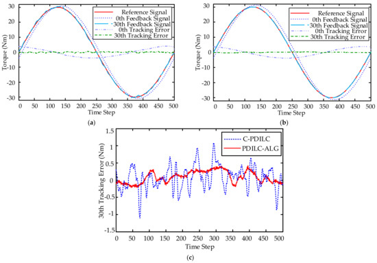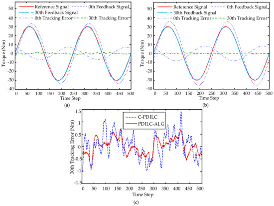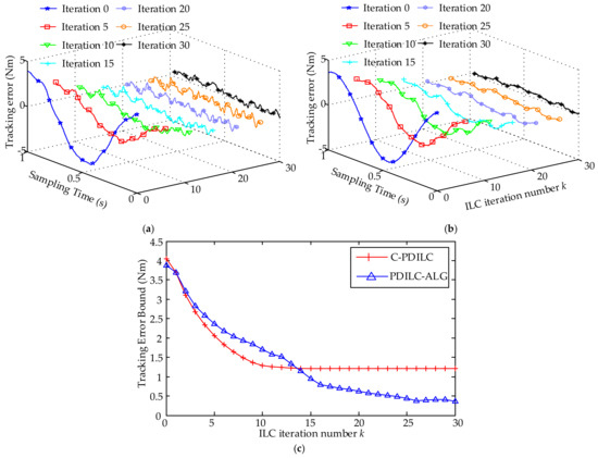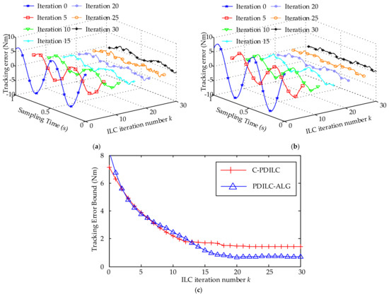 From Table 5 and Figure 8c, it is obvious that the PD-type ILC with adaptive learning gains has a smaller tracking error whose tracking error bound during the 30th iteration is about , whilst the tracking error bound based on conventional PD-type ILC is about . From Table 6 and Figure 9c, it can be seen that the PD-type ILC with adaptive learning gains has a smaller tracking error whose tracking error bound during the 30th iteration is about , whilst the tracking error bound based on conventional PD-type ILC is about . Due to the presence of the random measurement noise, the conventional PD-type ILC cannot ensure accurate loading torque tracking. The proposed PD-type ILC with adaptive learning gains can obviously improve the tracking performance, although the convergence rate is compromised.