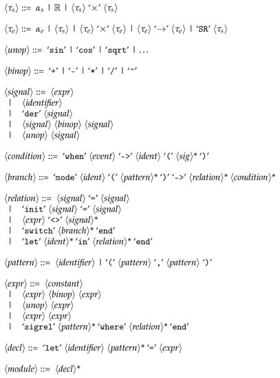 This section aims to provide an introduction to non-causal hybrid modelling using simple examples from electronics. This is done in the context of Functional Hybrid Modelling (FHM), as implemented in the language Hydra2 (https://gitlab.com/chupin/hydra-v2, accessed on 29 March 2021). We start by introducing the fundamental concepts around which FHM is built and then show how it forms an expressive and modular modelling paradigm. The abstract syntax of Hydra2 is given in Figure 1.