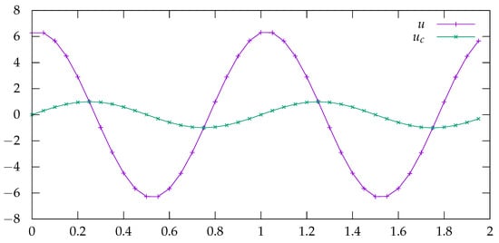 A general approach to this problem is to eliminate constraint equations by means of differentiation. Indeed, if holds at every point in time, then holds too. Replacing Equation (12) by this new, latent, equation yields a DAE which is not structurally singular. If the initial conditions of the variables in the system verify both the latent equations and the constraint equations, then the solution for the new DAE is the same as the one for the original DAE [22]. Simulation results for a Hydra2 model corresponding to the system of Equations (7)–(12) is given in Figure 4, with the function .