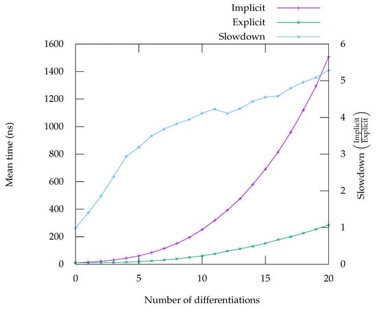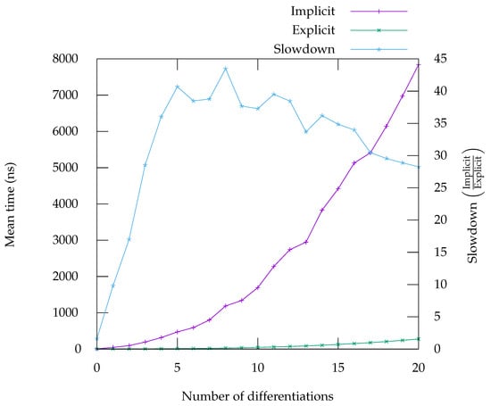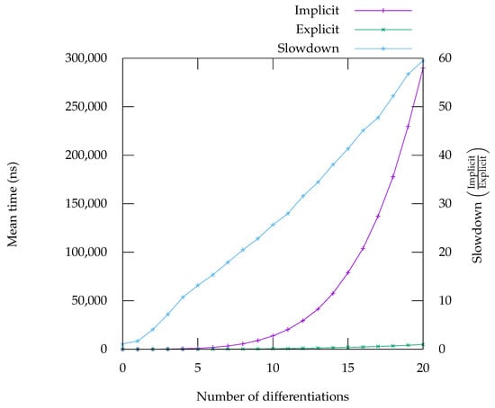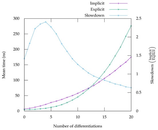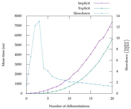 The benchmarks were obtained by generating LLVM [31] code from the Hydra2 compiler (The resulting LLVM code as well as the benchmarking code can be found at https://gitlab.com/chupin/hydra-v2/-/tree/separate_compilation/examples/benchmark, accessed on 29 March 2021). The resulting code was then compiled with clang on the O3 optimisation level and benchmarked using Google’s benchmark library (https://github.com/google/benchmark, accessed on 29 March 2021). The benchmarks were run on a PC with a 4-core Intel i3-7100T @ 3.4 GHz and 8 GB of RAM. Results are presented in Figure 5, Figure 6, Figure 7, Figure 8 and Figure 9. On the graph, labelled “Implicit” is the curve giving the runtime for the code generated in implicit form, meaning it can compute any n derivatives. The curve labelled “Explicit” corresponds to the runtime for code that has been specifically generated by using repeated application of first-order automatic differentiation, as presented in Section 5.1. The “Slowdown” curve corresponds to the ratio of the time taken by the implicit form over the time taken by the explicit form, it should be read on the second y-axis.