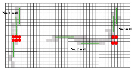 Example of vertical points’ uncertainty. There are three walls in the map. The gray grid is the obstacle, the green line is the line identified by Hough transform, and the red point is the vertical point extracted by method mentioned in Section 3.1.1. The six vertical points on the left are intersection points of line features extracted from No. 1 wall and No. 2 wall. The four points on the right are intersection points of line features extracted from No. 2 wall and No. 3 wall.
