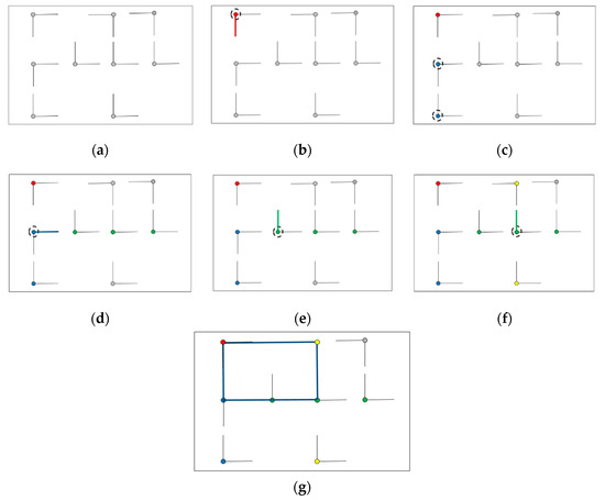 The process of building a suppositional box. (a) The gray point is the extracted vertical point, and the two straight lines are the direction of the vertical straight line. (b) The red point is a randomly selected vertical point; the red line is the target straight line direction. The blue point is the vertical point that matches the red line, forming candidate group one, as in (c). (d) Randomly select a point from candidate group one as the target circled in the figure, the blue line is the target straight line. The green point is the vertical point that matches the blue line, forming candidate group two. (e) Randomly select a point from the candidate group two as the target circled in the figure, there is no matching point. (f) Choose another point from the candidate group two. The green line is the target straight line, and the yellow point is the vertical point that matches the green line. (g) A suppositional box is formed by the constraint matching of length and width.