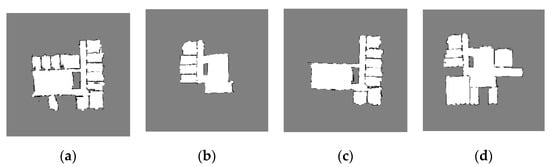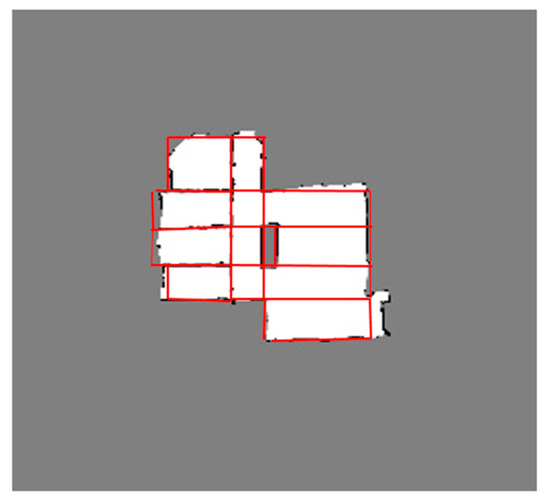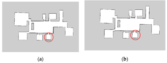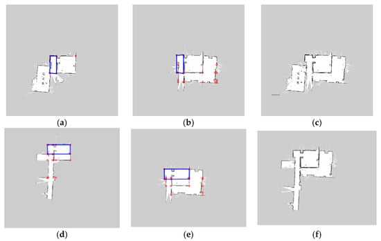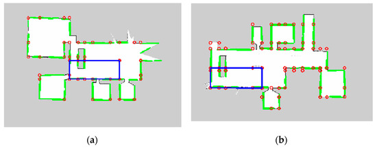 The robots walk around in the environment and build two-dimensional grid maps. Taking into account the diversity of the environment, the robot builds four local maps in the real environment and divides them into two different groups for map merging. In Experiment 1, the robot explored a normal indoor environment with rooms in different directions. In Experiment 2, the robot explored a long corridor, which can construct multiple similar suppositional boxes. The experimental results are shown in Figure 13.