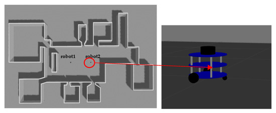 In Ubuntu environment, we use Gazebo [38], a simulation software, to construct a simulation environment, as shown in Figure 6. In our implementation, the simulation robots equipped with lidar sensors construct two maps through the Gmapping [39] package in ROS. The Gmapping package can use the virtual lidar sensors to build a two-dimensional grid map based on the method of particle filtering. As the mapping area extending, the amount of data carried by particles will increase, resulting in an increase in the amount of calculation. However, compared with other mapping methods, it has a small computation cost and high accuracy in the small scenes.