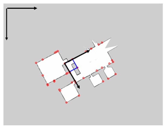First, straight lines are detected in the grid map through Hough transform, and the slope and intercept of each straight line is calculated. Then, the slopes are used to find two perpendicular straight lines, that is, when two straight lines are perpendicular, the slopes of them are multiplied to −1. If two straight lines are in a perpendicular relationship, the intersection point of two straight lines is as the vertical point, as and in Figure 2.