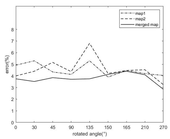 Other rotated angle values in (0°, 360°) are randomly experimented to further illustrate the merging performance. The error results are shown in Figure 11. On the whole, the error of the merged map is about 4%, showing that the merged map is accord with the actual environment. From the analysis of different rotation angles, it can be seen that when the rotation angle is small, the error of the map does not change much. In the case of a large rotation angle, the error in local map increases due to the map rotation operation, and thus the error in merged map also increases. Even so, the error in merged map is still within 5%. In conclusion we can say, our proposed method based on suppositional box matching is not affected by map rotation.