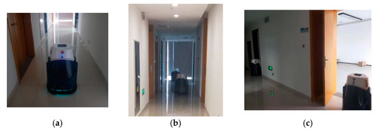 Real environment. (a) The Fuxi cleaning robot. (b) Two robots are exploring the corridor. (c) Two robots are exploring different rooms.