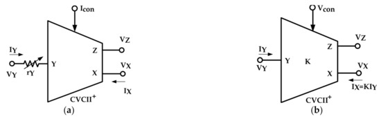 Symbolic representations of CVCII with electronically tunable Y port impedance and electronically tunable current gain at X terminal are shown in Figure 1a,b, respectively. The operation matrix of CVCII with electronically variable impedance at Y port is given in (1a). Here, the current gain between the Y and X ports and the voltage gain between X and Z ports are ±1 (+1 for CVCII+ and −1 for CVCII−). The impedance at Y port is shown by which can be tuned by . The operation of CVCII with electronically variable current gain is given in (1b). In this case, the impedance value at the Y port is ideally zero, the value of the voltage gain between the X and Z ports is unity, while the value of current gain between Y and X ports is ±K (+K for CVCII+ and −K for CVCII−) which is adjusted by the control voltage .