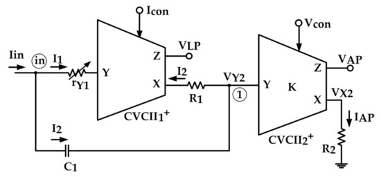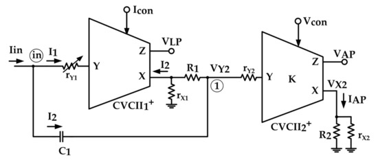 Figure 4 shows the proposed LP/AP filter of Figure 2 in nonideal condition where all parasitic elements are modeled. The parasitic elements related to the CVCII1+ are named and while those related to the CVCII2+ are named and .