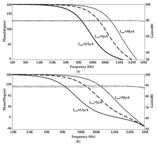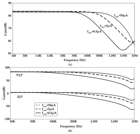 Figure 12 reports the frequency performances of and outputs for different values of and . The value of for HP outputs is 81 kHz, 360 kHz and 1 MHz for = 0.5 µA, 5 µA and 50 µA, respectively. The gain of varies from 0.980 dB to 29 dB for variation from 0.185 V to −0.9 V. For gain, variation is from 60 dB to 88.9 dB. The THD values are 7.7% and 10% for and for input signal of 1 MHz and 5 µA peak to peak value and = 50 µA and = −0.9 V.