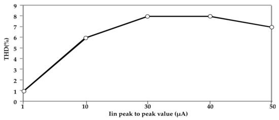 Low-pass (LP) output total harmonic distortion (THD) value for a sinusoidal input signal with frequency of 1 MHz ( = 50 µA) at different values of input signal for the filter reported in Figure 2.