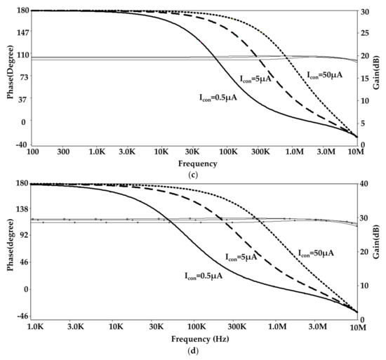 Gain and phase frequency response of (a) for = 0 V, (b) for = −0.9 V, (c) for = 0 and (d) for = −0.9 V.