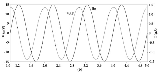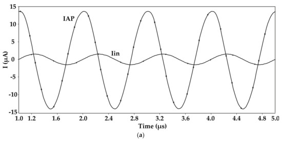 Figure 10 shows the gain and phase frequency performances of the and outputs for different values of and from which the electronic tunability of both frequency and gain is evident. To examine the time domain performance of the proposed AP filter, a sinusoidal input with peak-to-peak amplitude of 2 μA and frequency of 1 MHz is applied to the proposed circuit. For = 50 µA and = 0 V, the input and output signals are shown in Figure 11, where an 87° phase shift for both produced and is found. In this case, THD is 2%.