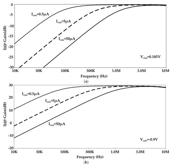 As is seen from (24), the value of is controllable by . Therefore, the appropriate value of the Y port impedance can be achieved by setting the value of . To set zero offset voltage at the Y port, is also applied to the drain of , so the DC value of gate–source voltage of and is kept equal, resulting in zero DC offset voltage at Y port.