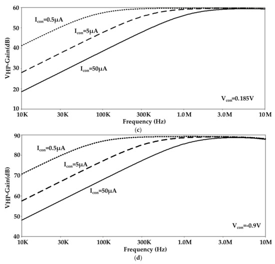 Gain frequency response of (a) for = 0.185 V (b) for = −0.9 V (c) for = 0.185 V and (d) for = −0.9 V at three different values of for the filter proposed in Figure 3.