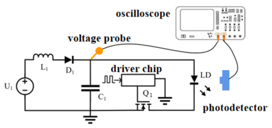 Based on the above design ideas, the schematic diagram of the laser diode drive circuit and the test platform are shown in Figure 2. is the energy storage capacitor. is an inductor used to limit current and provide higher voltage on . is a high-speed diode (1N4148). is an enhancement mode power transistor (EPC2019 from Efficient Power Conversion Corporation). is a semiconductor laser diode SPL DS90A_3 from OSRAM. The value of and will be discussed in Section 2.3.