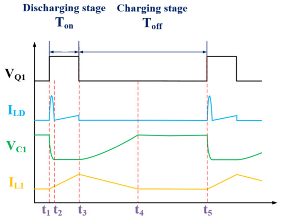 In order to facilitate understanding, the timing diagram of circuit working process is shown in Figure 5. The discharging stage and charging stage correspond to the and of . During –, the laser diode emits laser pulse and there is a large pulse current, and the capacitor is completely discharged during this period. During –, the laser diode no longer emits laser pulse, and the DC current in Figure 3b keeps increasing. When is turned off, the capacitor is charged by and during –. – is the waiting time after is completely charged.