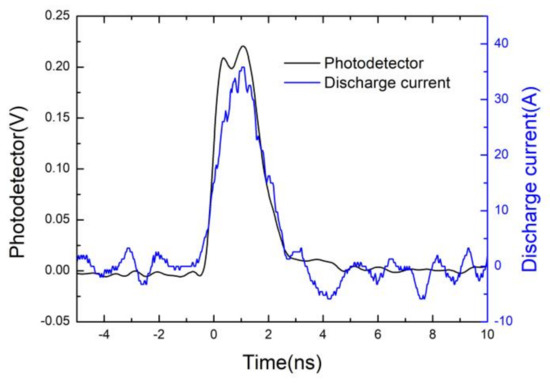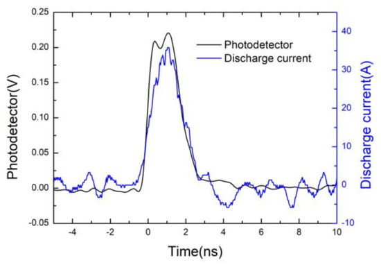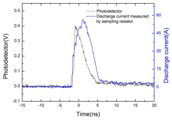 Often, a sampling resistor is added to the discharge circuit to obtain the discharge current waveforms. In our previous experiments, we also adopted this scheme. However, the current waveforms obtained by sampling resistor have some problems. Figure 8 shows the comparison between the discharge current waveform measured by sampling resistor and the laser pulse waveform by photodetector.